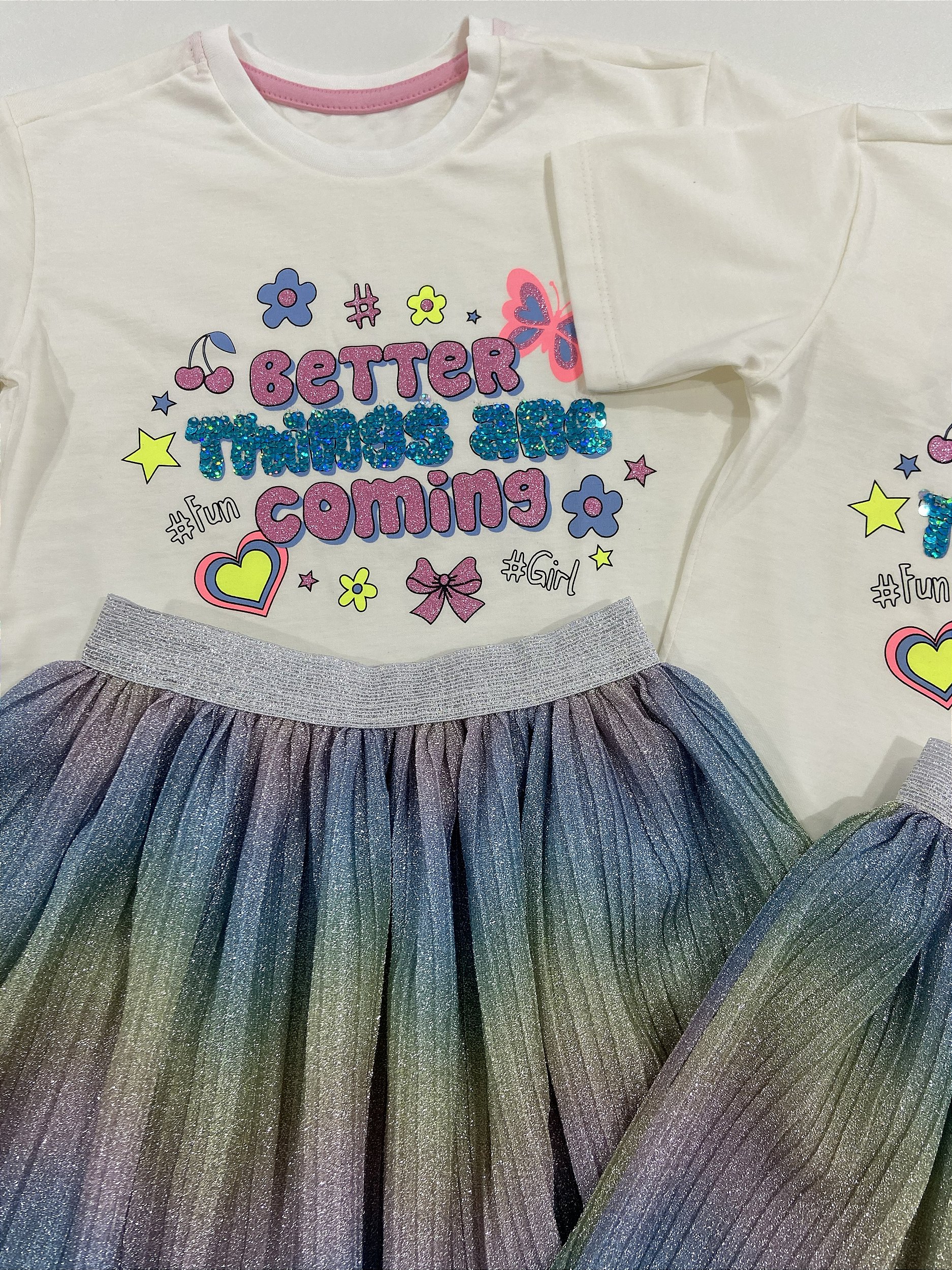 A camiseta em malha 100% algodão traz uma estampa divertida com paetês brilhantes, cheios de charme e cor.