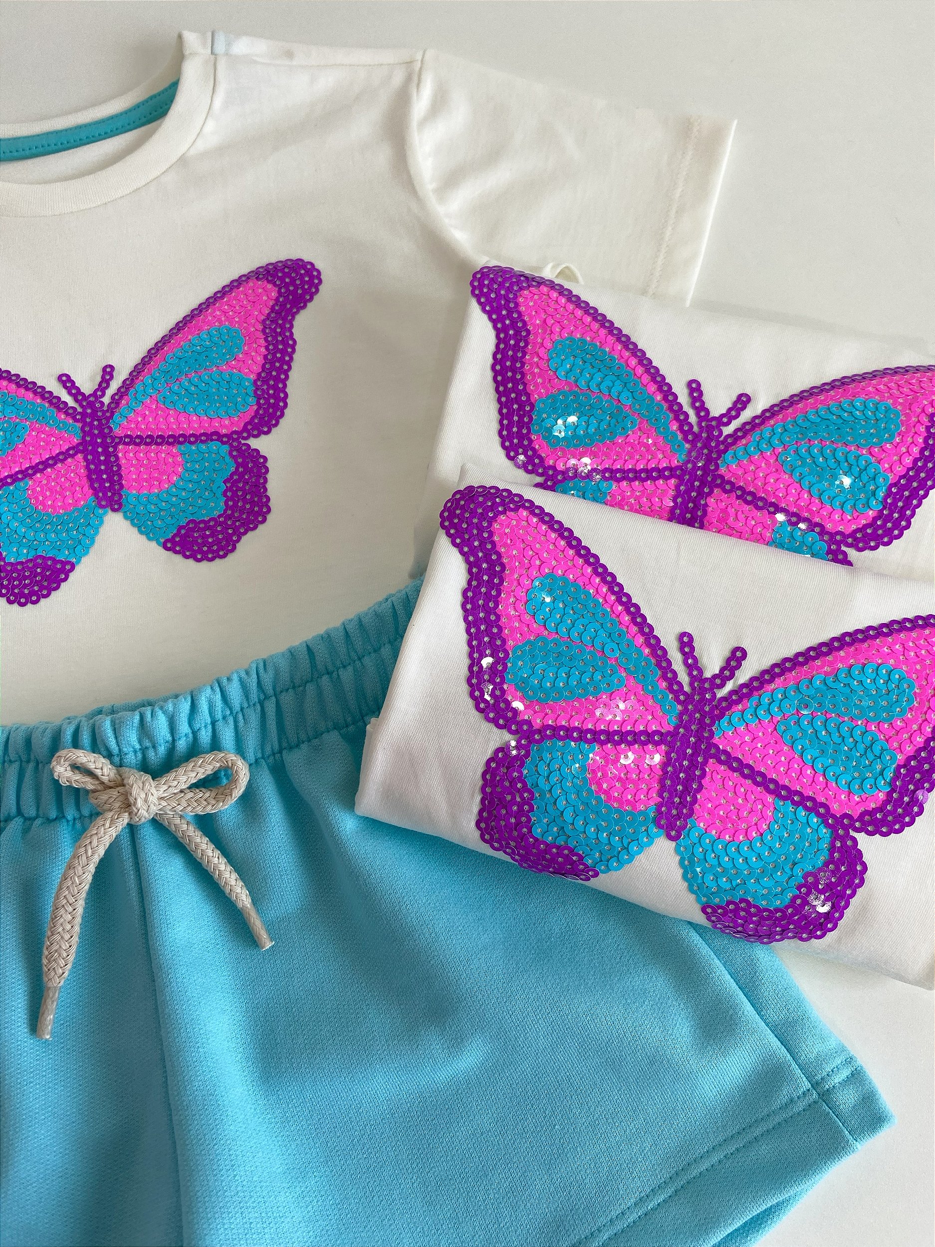 A camiseta em malha 100% algodão traz uma estampa de borboleta com paetês que brilham em cada detalhe. O short em moletom macio (50% algodão, 50% poliéster) garante conforto e liberdade para brincar. Um look alegre, cheio de charme e perfeito para os dias ensolarados.