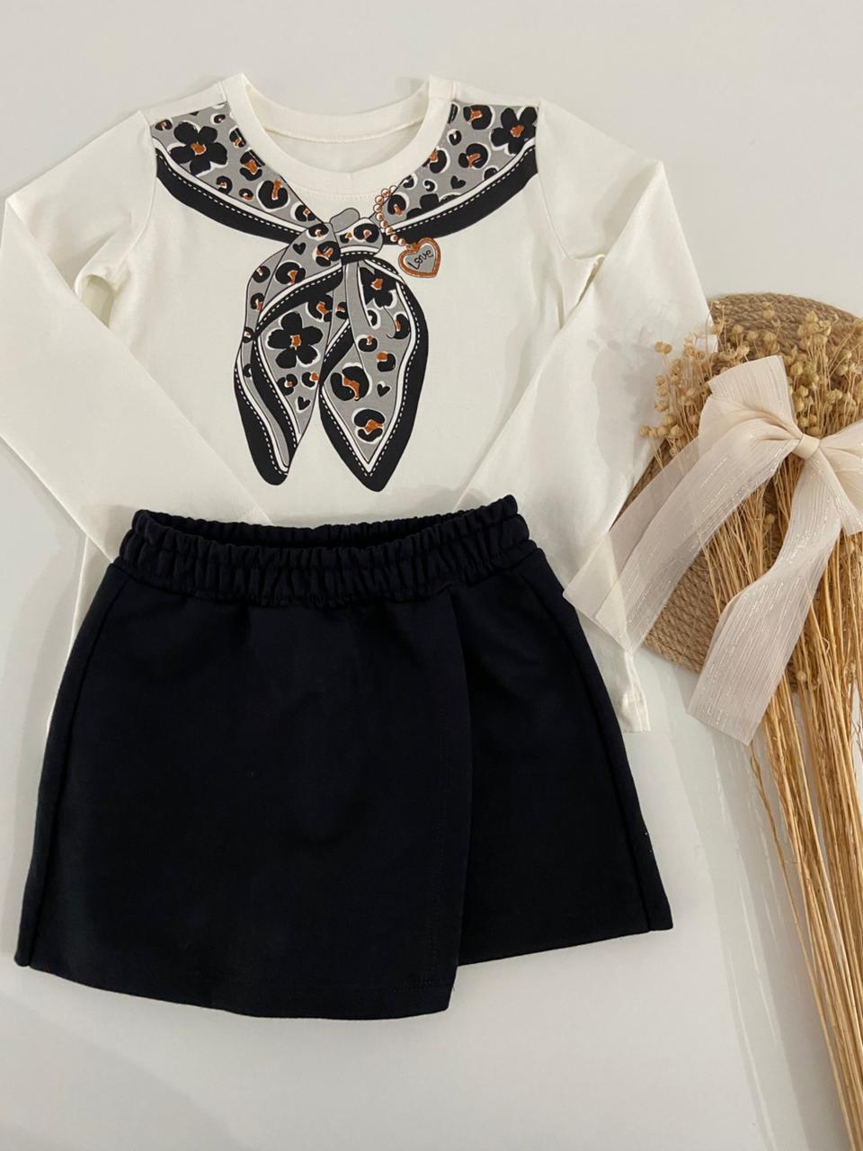 Um conjunto elegante e moderno que combina charme e personalidade. A camiseta em 100% algodão na cor off traz estampa sofisticada que simula um lenço de oncinha, criando um visual fashion e delicado. O short saia completa o look, perfeito para ocasiões especiais ou passeios cheios de estilo.