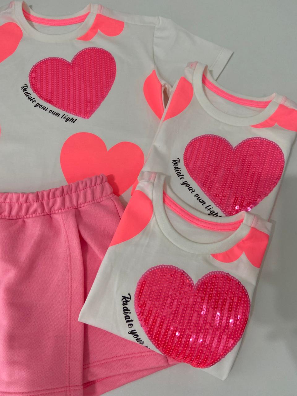 Conjunto infantil confortável e cheio de alegria! A camiseta em algodão traz estampa de Corações e paetê combinada com short saia em moletom leve e macio, ideal para os dias mais divertidos.